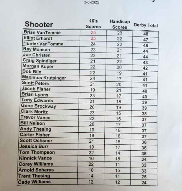 We must have 10 shooters to have a derby. Cancellations due to weather will be posted here and on the club Facebook page the morning of the shoot.
